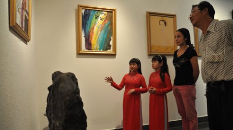 Ngước mắt lên thật cao mới nhìn thấy vật treo tường, Hằng và Hà khiến nhiều khách tham quan thú vị khi giải thích cặn kẽ từng bức tranh, từng món cổ vật ở phòng trưng bày của tạp chí Kiến Thức Ngày Nay – Ảnh: Gia Tiến