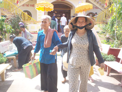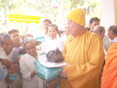 Sáng ngày 29/05 (tức ngày 16/04 ÂL) trời mới tờ mờ sáng, mặc dù chưa đến buổi lễ nhưng chúng tôi đã bắt gặp nhiều trẻ con cùng người già trên tay cầm bọc ni lông hay giỏ để chuẩn bị nhận gạo vì họ cho biết mỗi năm chỉ chờ có một ngày này nên khi nghe nhà chùa phát gạo là chỉ mong cho trời mau sáng để đến đây.