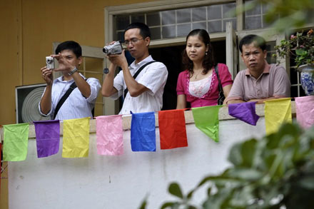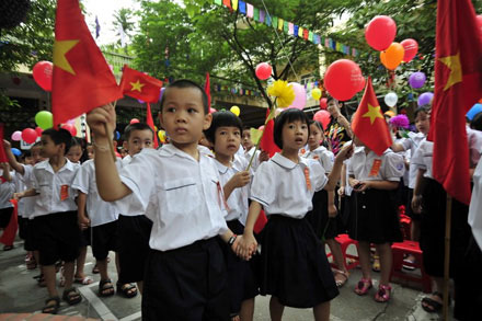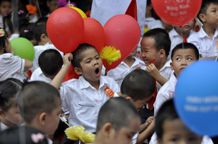 Những em bé còn bỡ ngỡ, mắt tròn ngơ ngác, có bé còn ướt nước mắt nhưng không kém phấn háo hức khi dự lễ khai giảng đầu tiên.