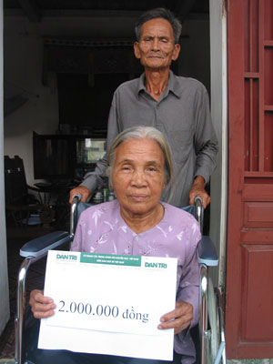 Vợ chồng ông Tằng, bà Nguyệt bên xe lăn cùng số tiền 2 triệu đồng do Báo điện tử Dân trí ủng hộ