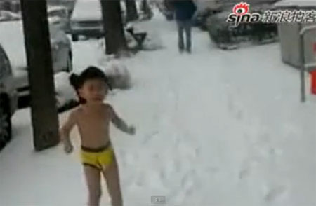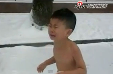 Hình ảnh cậu bé 4 tuổi người trần chạy trong tuyết lạnh đã gây phản ứng mạnh ở Trung Quốc.