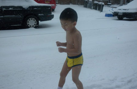 Cậu bé 4 tuổi He Yide người trần co ro trong tuyết lạnh ở New York.
