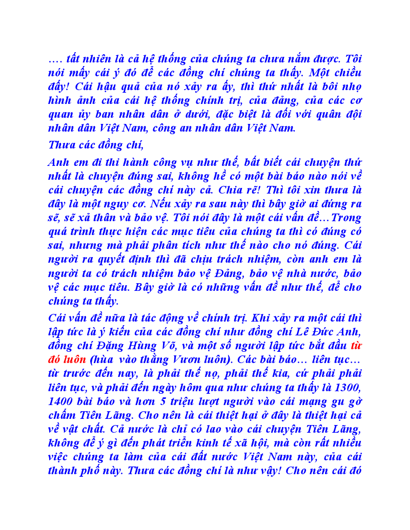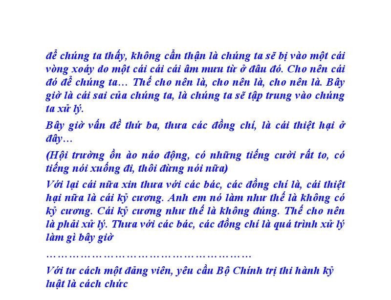 Cu Vinh: Mình đã không muốn đưa Clip này lên, vì đã có kiến nghị của các cụ lão thành cách mạng gửi Trung ương Đảng, nhưng do có công văn trên của CLB Bạch Đằng gửi Trung ương, nghĩ rằng, nếu mình không đưa clip lên thì các cụ dễ bị quy chụp. Đoạn clip sau đây cho thấy sự phản ứng dữ dội của các lão thành cách mạng với ý kiến của Bí thư Thành như thế nào, và có đúng như công văn của CLB Bạch Đằng là Hội viên CLB Bạch đằng rất hoan nghênh và nhất trí cao hay không.