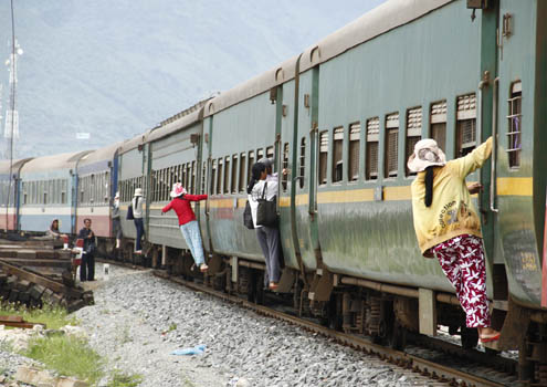 Mỗi lần qua đoạn đèo quanh co tàu giảm tốc độ, mấy phụ nữ nhảy xuống các toa qua ô cửa bán hàng, rồi lại leo lên nóc tàu trốn bảo vệ. “Mấy ông nhìn thấy là xua đuổi, nhảy vào giật hàng quăng qua cửa, thậm chí còn lấy giầy thúc vào người nên phải lo trốn”, chị Ánh, thở hổn hển khi vừa leo từ toa tàu xuống đất cho biết.