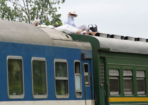 Và nằm gọn trên nóc tàu nghỉ lấy sức trèo vào các toa để bán hàng cho khách. Ảnh: Nguyễn Đông