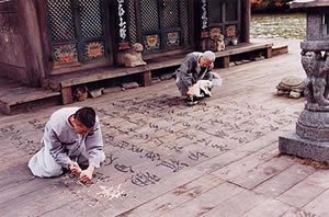 Cũng tất nhiên, cảnh sát đến chùa bắt kẻ sát nhân. Cảnh sát có súng. Sát nhân có dao. Dao ấy hươi lên trước súng. Máu sẽ đổ chăng ? Ðổ trên sân chùa ? Ðổ trên lưng ông già đang lom khom nắn nót viết chữ trên sân ? Ðâu có ! Không rời bút, cũng chẳng nhìn lên, ông bảo chàng thanh niên buông dao. Dao buông xuống thì dao hết là dao. Dao hết là dao thì súng cũng hết là súng, cảnh sát hết cảnh sát, thanh niên hết râu tóc. Chỉ còn chữ viết trên sân. Với con dao đã buông, ông bảo chú thanh niên tiếp tục khắc chữ trên nền sân, khắc theo chữ ông viết. Chú khắc suốt ngày và suốt đêm. Khắc rách da tay, khắc kiệt sức. Khắc : sắc bất dị không, không bất dị sắc, sắc tức thị không, không tức thị sắc, thọ tưởng hành thức diệc phục như thị… Bài kinh Bát nhã.