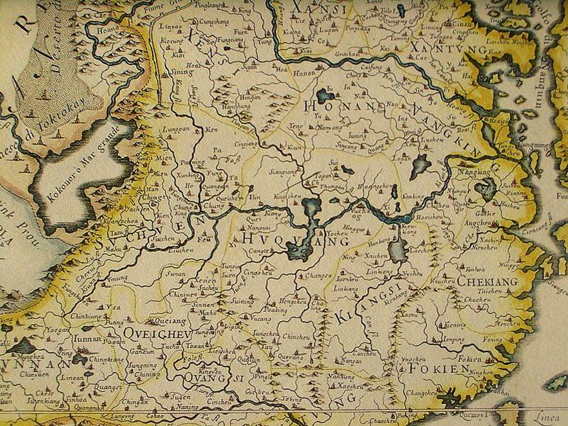 Bản đồ TQ vào thế kỷ 17 in ở nước ngoài (Tây phương, in bằng chữ La Tinh) – trích trang http://en.wikipedia.org/wiki/Romanization_of_Mandarin_Chinese . Để ý cách dùng x, si, qv trong bản đồ so với bính âm sh, xi và qu (tự điển Việt Bồ La ghi về vật … là uề uật …). Để ý âm cổ hơn của giang jiāng 江 là kiang, -jing trong Nam Kinh Nánjīng 南京, Phúc Kiến Fújiàn 福建 … là Nanking, Fokien …