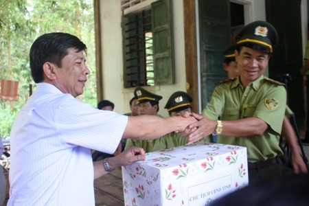 Ông Nguyễn Hữu Hoài, Chủ tịch UBND tỉnh Quảng Bình tặng quà cho Đội kiểm lâm cơ động và PCCCR số 1 (Chi cục Kiểm lâm Quảng Bình)