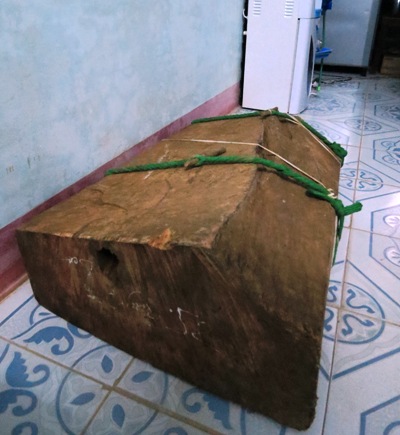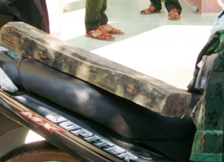 Hạt Kiểm lâm VQG Phong Nha – Kẻ Bàng vừa bắt giữ một tấm gỗ sưa, nặng 52kg, (được cho là đe của một trong 3 cây sưa nói trên) ở Sân bay Khe Gát (Ảnh: Đ.T)