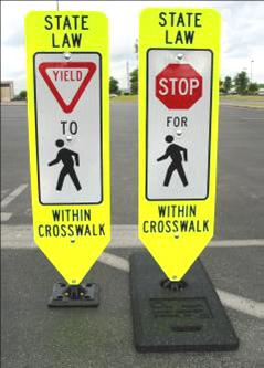Và mình nhìn kỹ hai bên đường xem có gì nhắc nhở mọi người như thế không, thì thấy bên đường, xa xa lại có một bảng nhắc nhở “nhường” hay “ngừng” cho người đi bộ, và đó là luật tiểu bang. À, mình chẳng biết tiểu bang có luật như thế. Minh luôn nghĩ là luật về nhường đường cho người đi bộ chỉ áp dụng tại các crosswalk có đèn giao thông, hay ít nhất là ở ngã tư, không có luật tại các crosswalk khơi khơi giữa đường mà chẳng có đèn đóm gì gần đó như crosswalk này.