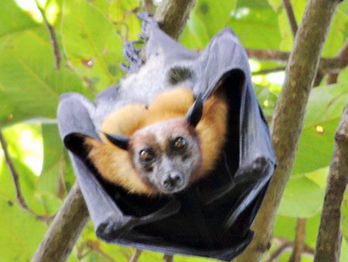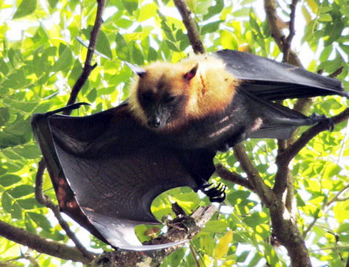 Một chú dơi khác nặng hơn 1kg, sải cánh chừng 2m. Con dơi này một chân treo trên cây, đang lim dim ngủ ngày. Hai loài dơi ở ngôi chùa cổ trên 400 tuổi ở Sóc Trăng là dơi ngựa lớn và dơi ngựa Thái Lan, đang được Tổ chức bảo vệ động vật hoang dã thế giới cấm săn bắt, buôn bán vì có nguy cơ tuyệt chủng. |