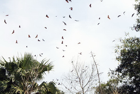 Chiều xuống, du khách ngồi bên khu du lịch được nhìn đàn dơi hàng nghìn con bay đi tìm mồi. Sáng sớm chúng lại về với chùa để treo mình ngủ trên cây. |