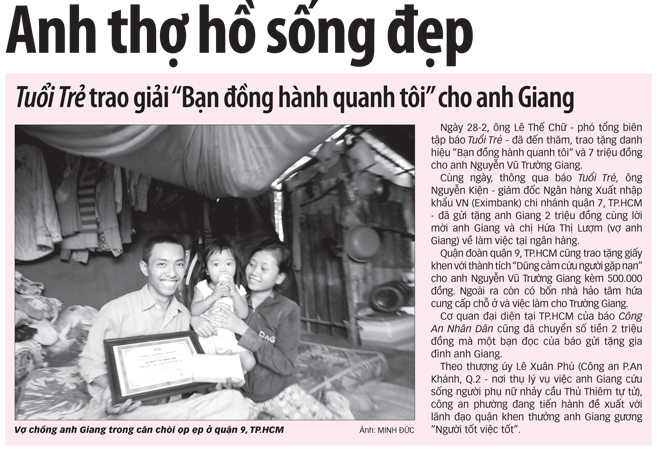Tuổi Trẻ – Người chồng cách đây 2 năm dũng cảm lao ra giữa dòng sông Sài Gòn cứu 1 cô gái tự tử.