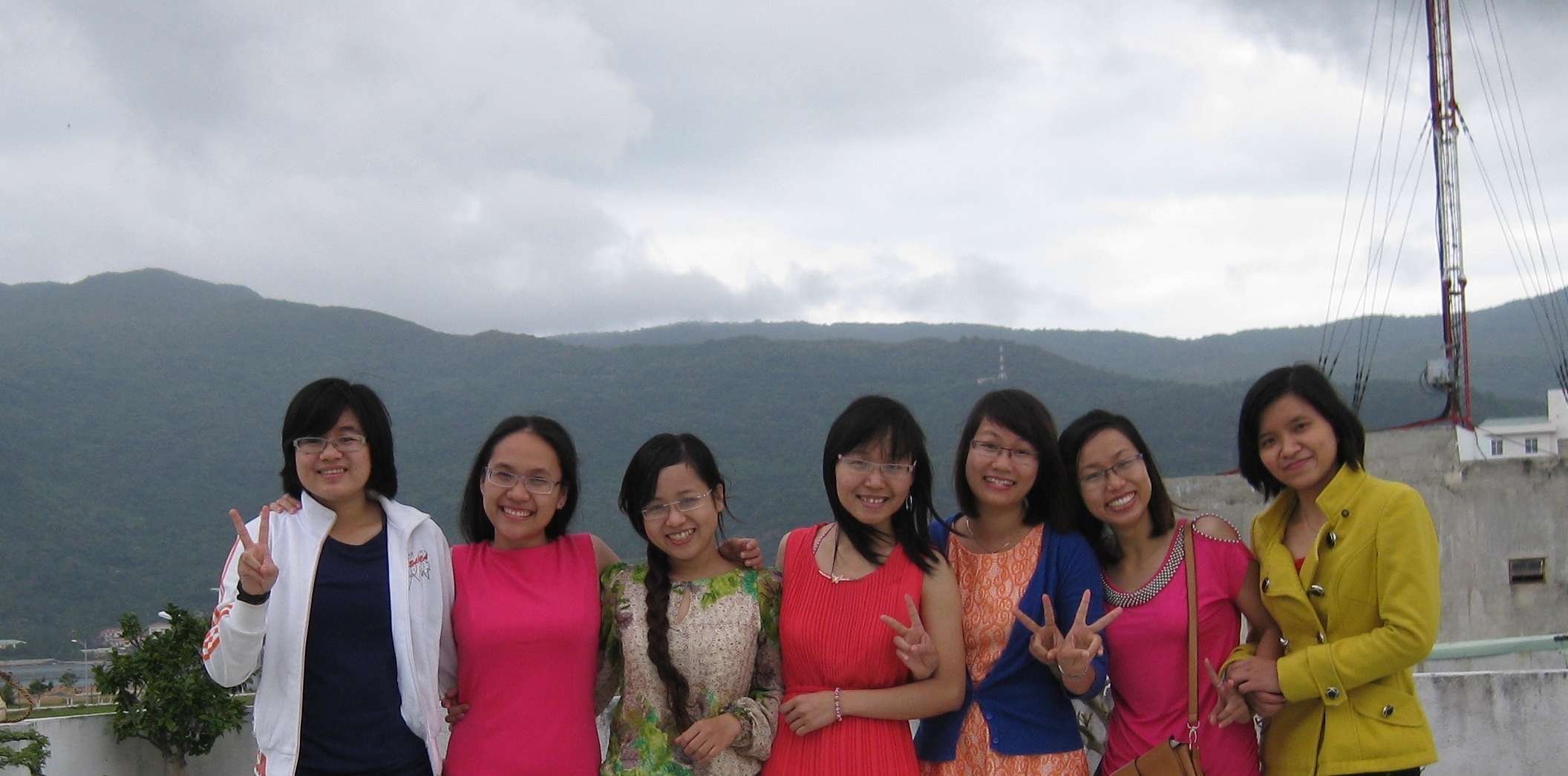 Ảnh chụp trên sân thượng nhà em, sau lưng là núi Sơn Trà :D. Từ trái qua: Phương, Huyền Vân, Thu Hương, Ngọc Nho, Minh Châu, Tố Nhi & Vân Anh.