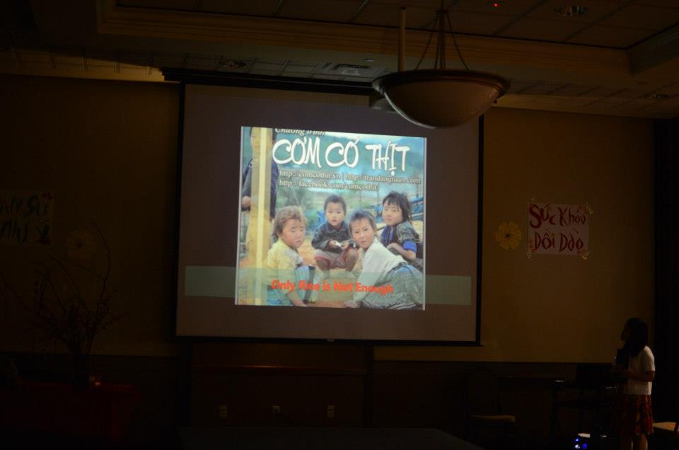 Giới thiệu về chương trình “Cơm có thịt” và bán đấu giá 3 món đồ gồm có 1 chiếc xích lô, 1 chiếc tranh thêu và 1 chiếc tranh tre. Ngoài ra các bạn còn có bàn gây quỹ vừa trưng bày và bán các sản phẩm mỹ nghệ Việt Nam như thiệp, túi thổ cẩm, khăn lụa, bookmarks…được mọi người mua ủng hộ rất nhiều.