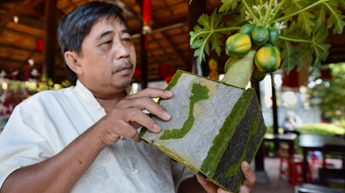 Theo lời mách bảo của bạn đọc, trưa 18-2 chúng tôi đến trước chùa Long Vân ở đường Bùi Đình Túy (Q.Bình Thạnh) hỏi thăm về mặt hàng cây cảnh giả có chậu in hình bản đồ, mấy chị bán chuối chiên, rau quả trước cổng chùa khẳng định: “Trong chùa bán nhiều lắm, vô đó mà hỏi!”.