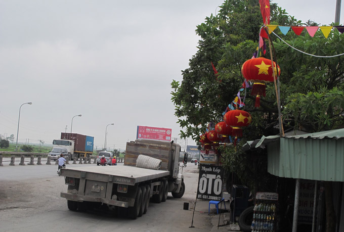 Người dân trên quốc lộ 5 (đoạn qua khu vực Quán Toan, Q.Hồng Bàng, Hải Phòng) đã cắt hình sao vàng dán đè lên chữ “Tam Sa” trên đèn lồng Trung Quốc – Ảnh: Thân Hoàng