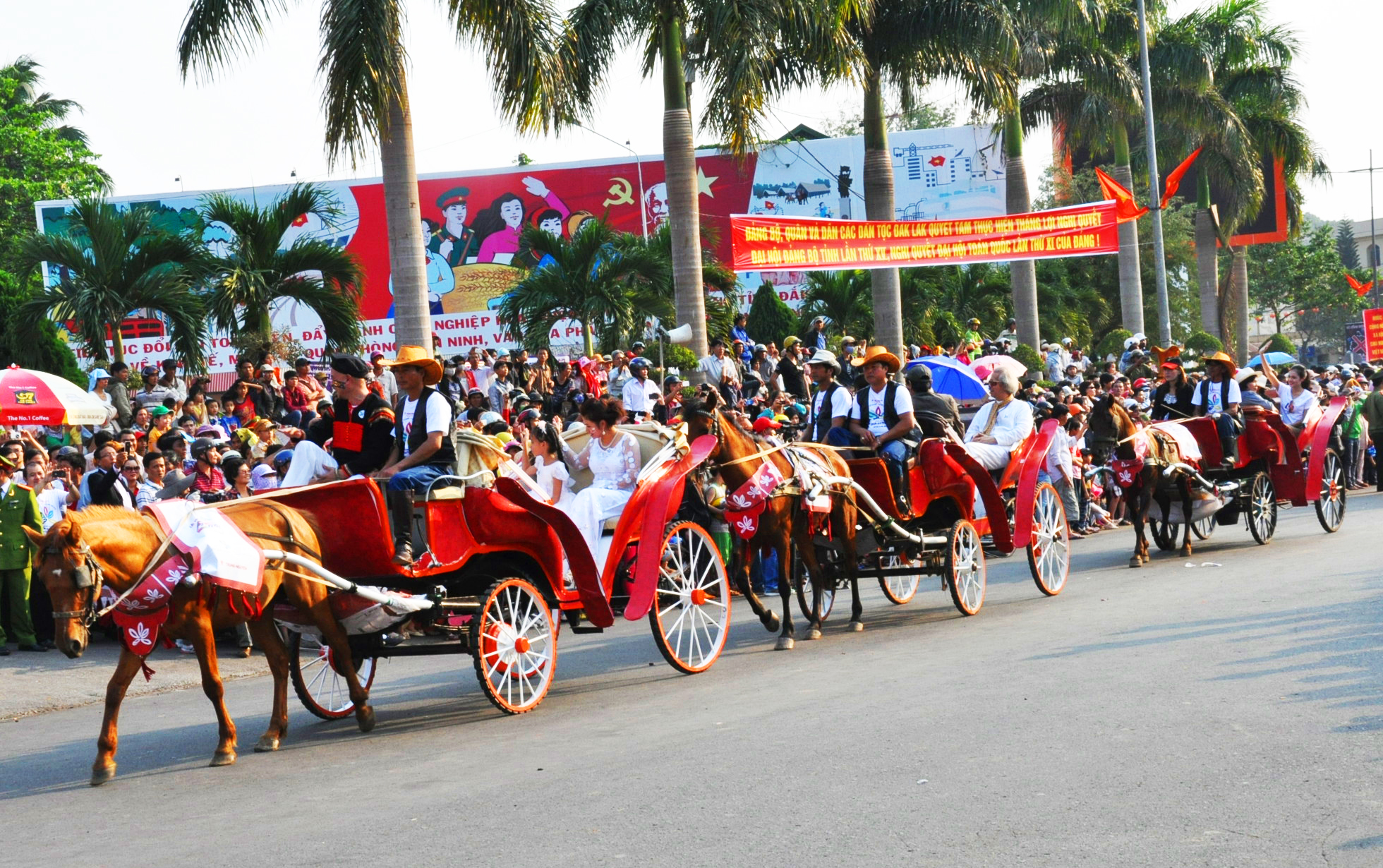 Chiều cùng ngày, khu vực trung tâm Buôn Ma Thuột náo nhiệt với lễ hội đường phố đậm đà sắc màu văn hóa các dân tộc. Hàng vạn người đổ ra các trục đường chính vẫy chào lực lượng diễu hành đa dạng, với đội voi huyện Lắk, các đoàn xe hoa, xe ngựa, mô tô các loại, cồng chiêng, cà kheo, đại sứ cà phê v.v…