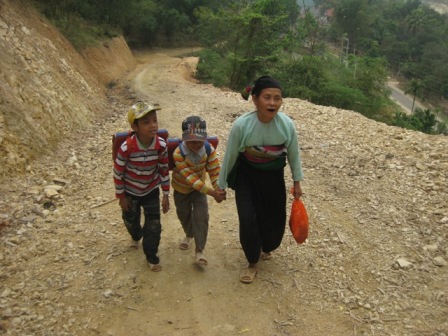 Trên lưng cõng cháu nhỏ, tay dắt cháu lớn, suốt 3 năm qua bà Mu không quản mưa nắng, đều đặn đưa các cháu đến trường.
