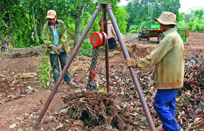 Gia đình anh Y M’lai đang nhổ bỏ gốc cà phê già cỗi để bắt đầu tái canh gống mới – Ảnh: Tr.Tân