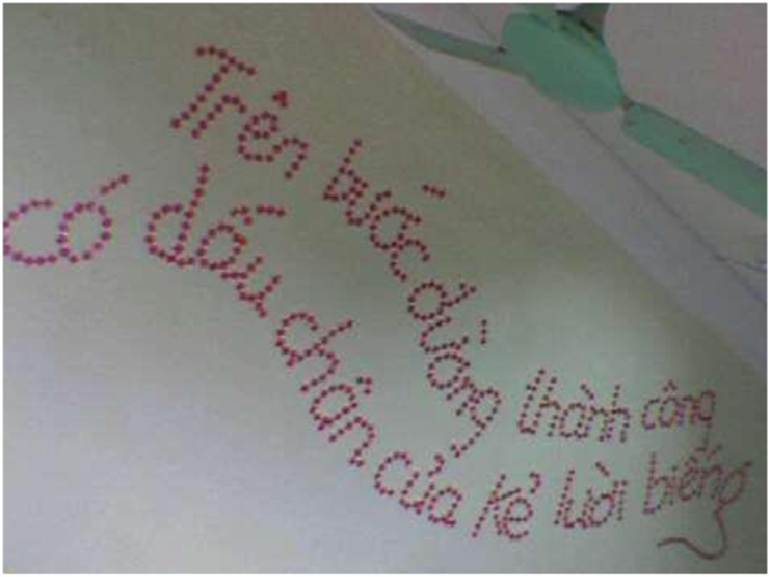 Lớp trưởng của chúng tôi (giờ chỉ còn 11 đứa!) là một cô nàng tóc dài, đeo kính nhưng phong cách cực kì phóng khoáng và mạnh mẽ, đặc biệt nhạy bén với… tin tức tình báo! Bạn lúc nào cũng rất tích cực động viên cả lớp và vẫn liên hệ đều đặn với 3 thành viên bên ngoài (đang làm quen với hoàn cảnh mới một cách nhanh chóng). Để nâng cao tinh thần cả lớp, chúng tôi mua giấy màu về và định dán trên tường dòng chữ: “Trên bước đường thành công không có dấu chân của kẻ lười biếng”, nhưng vì rất lười nên chỉ dán được 5 chữ “Trên bước đường thành công” thì dừng… vô thời hạn. Cuối cùng trước khi ra trường chúng tôi cũng quyết định hoàn thành nó, nhưng quyết định bỏ chữ “không” trong câu đó đi, với khẩu hiệu “Nothing is impossible” (Không có gì là không thể)!