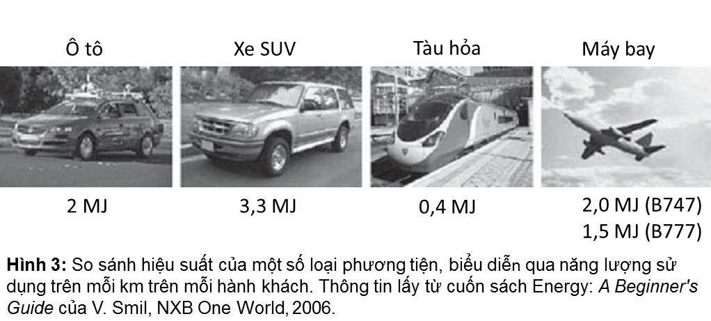 Tiêu thụ năng lượng cho mỗi hành khách trong một chiếc xe cỡ trung bình là khoảng 2 MJ/km; một chiếc SUV dẫn động 4 bánh tiêu thụ ít nhất 60% nhiều hơn (Hình 3). Có thể bạn sẽ ngạc nhiên khi biết rằng một chiếc máy bay hiện đại và hiệu quả cao, chẳng hạn như máy bay Boeing 777, tiêu thụ ít năng lượng hơn trên mỗi hành khách và mỗi cây số cơ sở so với một chiếc xe hơi. Tuy nhiên, trong một ngày, một chiếc máy bay có thể di chuyển khoảng cách tương đương với một chiếc xe hơi du lịch trong cả năm. Tác động khí hậu và môi trường của vận tải hàng không đang ngày càng bị tấn công, do liên kết với khoảng cách xa và thực tế là các chất ô nhiễm được phát hành ở độ cao lớn, đặc biệt là trong các khu vực dễ bị tổn thương của tầng đối lưu.