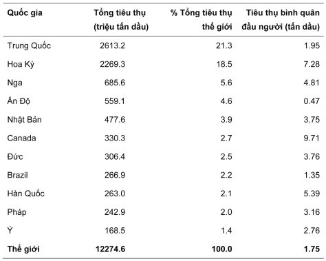 Bảng 5: Tổng số tiêu thụ năng lượng sơ cấp hàng năm trên thế giới: 10 nước đứng đầu cộng với Ý. Nguồn: BP thống kê đánh giá, năm 2012.
