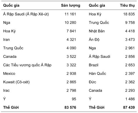 Tiêu thụ dầu mỏ toàn cầu (87.4 triệu thùng mỗi ngày) vượt quá sản lượng toàn cầu (83.6 triệu thùng mỗi ngày) vì con số này tính đến lượng dầu “tổng hợp” sản xuất từ ​​than đá và nhiên liệu sinh học (biofuels).