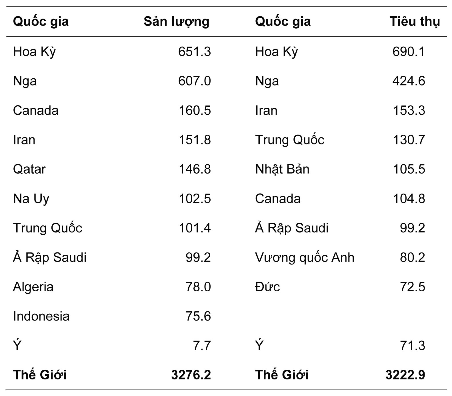 Bảng 6bSản xuất và tiêu thụ khí đốt tự nhiên theo đơn vị tỷ mét khối/năm.