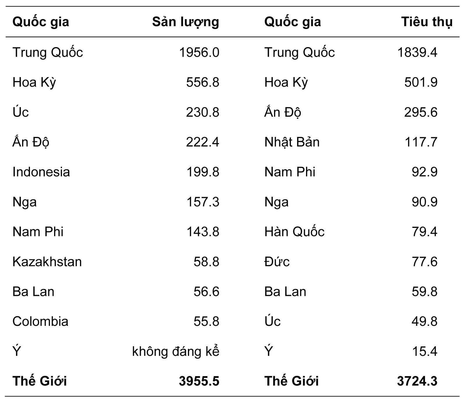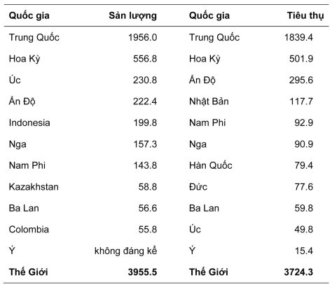 Bảng 6cSản xuất và tiêu thụ than theo đơn vị triệu tấn dầu tương đương (toe) mỗi năm.