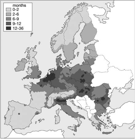 Hình 9. Các hạt bụi khí quyển sinh ra do sử dụng nhiên liệu hoá thạch rất độc hại cho sức khỏe. Bản đồ châu Âu cho thấy tuổi thọ trung bình giảm đi (theo đơn vị tháng) do tiếp xúc với PM–2.5 (bụi khí quyển có đường kính < 2.5 µm).