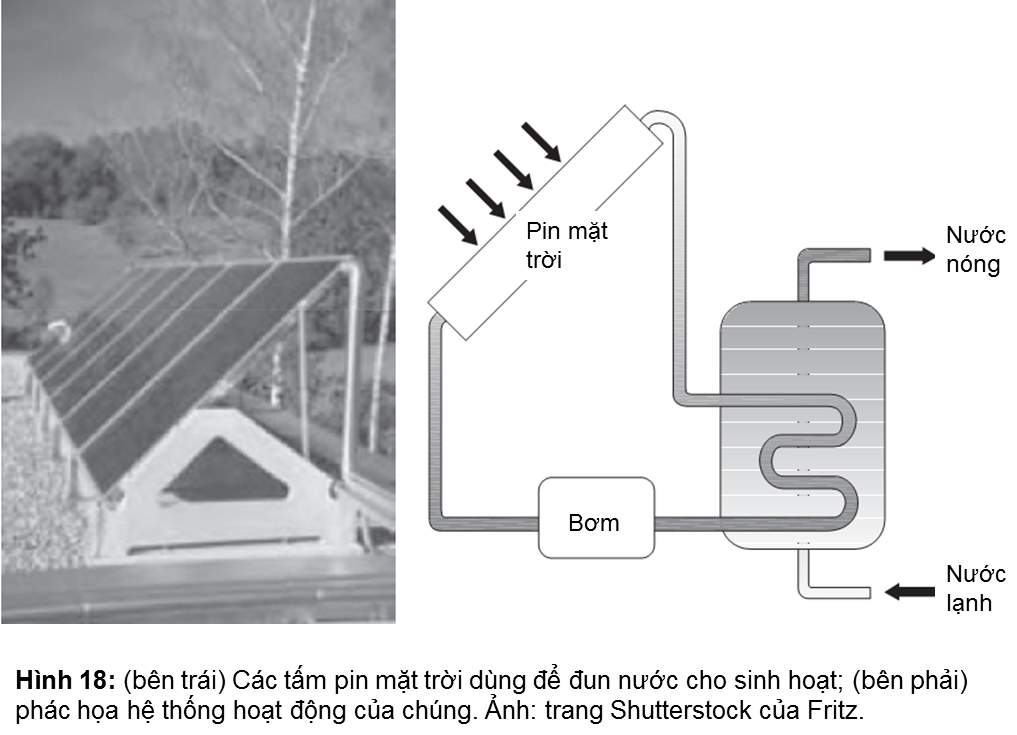Việc chuyển đổi năng lượng mặt trời về dạng năng lượng nhiệt ở nhiệt độ thấp có thể đạt được khi sử dụng các tấm pin mặt trời (solar panels), không nên nhầm lẫn với các tấm pin quang điện (photovoltaic panels) được sử dụng cho việc phát điện (các tấm pin quang điện sẽ được thảo luận sau). Các tấm pin mặt trời này hoạt động như là các trạm thu nhiệt trong đó một dung dịch chảy trong các ống bằng đồng được đốt nóng bởi ánh sáng Mặt trời và sau đó được sử dụng để trao đổi nhiệt với một bình chứa nước (Hình 18).