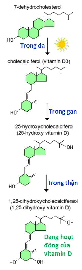 Vitamin D có tính trơ về mặt sinh học, và phải được chuyển đổi về dạng hoạt động bởi hai quá trình hydroxyl hóa trong cơ thể – quá trình mà các nhà hóa học sẽ đề cập như là việc thêm hai nhóm OH vào phân tử vitamin D trơ. Quá trình chuyển hóa đầu tiên diễn ra trong gan và chuyển vitamin D thành 1 sản phẩm tên là 25-hydroxyvitamin D – cũng được biết đến với tên 25(OH)D hay calcidiol (xem sơ đồ ở dưới). Quá trình chuyển đổi thứ hai được diễn ra chủ yếu ở thận và tạo thành sản phẩm hoạt động sinh lý 1,25-dihydroxy vitamin D, cũng được biết đến với tên 1,25(OH)2D.