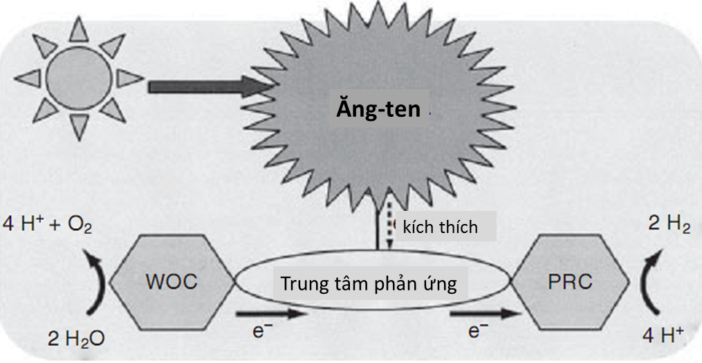 Hình 22: Mô tả quy trình của một hệ thống quang hợp nhân tạo để phân ly nước; WOC = Water Oxidation Catalist (xúc tác oxy hóa nước); PRC = Proton Reduction Catalyst (xúc tác khử proton). Trích từ D. Gust, T. A. Moore và A. L. Moore, Farday Discuss. 2012, 155, trang 9 – 26. Bản quyền năm 2012 của Hiệp Hội Hóa học Hoàng gia (The Royal Society of Chemitry).