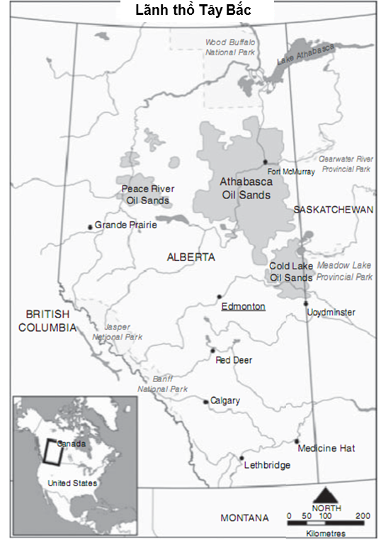 Hình 29: Bản đồ vùng Alberta (hình nhỏ: vị trí của Alberta ở Canada) thể hiện cát dầu ở Athabasca (vùng màu xám) được khai thác ở Canada