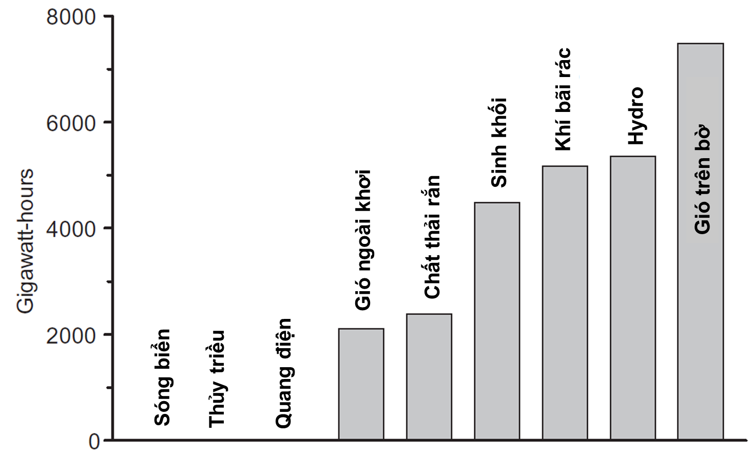 Xét về phương diện số TWh điện năng sản xuất, năng lượng gió trên bờ đóng góp nhiều nhất trong tất cả các dạng năng lượng tái tạo. Năng lượng sóng và năng lượng thủy triều, cùng với quang điện năng lượng mặt trời, đóng góp một phần không đáng kể.
