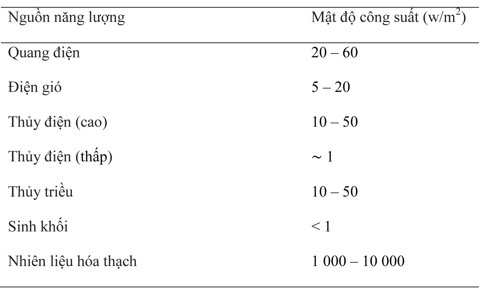Bảng 11. Tỉ lệ công suất trên diện tích bề mặt cho các các nguồn năng lượng khác nhau
