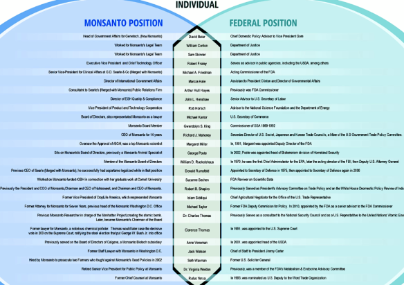 Để qua mặt được FDA đòi hỏi một cách tiếp cận hơi khác: bạn hãy nhấp chuột vào biểu đồ dưới đây được biên soạn bởi hàng triệu người Against Monsanto để xem có bao nhiêu cựu chủ tịch Monsanto và tư vấn pháp lý doanh nghiệp đang nắm giữ vị trí với FDA. Và đừng quên Clarence Thomas, cựu luật sư của Monsanto hiện đang là một thẩm phán của Tòa án Tư pháp tối cao, phán quyết ủng hộ Monsanto trong mọi trường hợp đã được đưa đến cho ông ta.