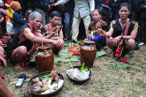 Già làng sẽ ngồi trước hai vò rượu và cúng, mời các thần linh về hưởng thụ…