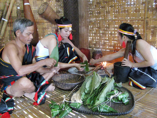 Buổi chiều, các chị, các mẹ quây quần bên nhau làm bánh lá đót (gói bằng lá đót), bánh lá tốp (gói bằng lá tốp) và bánh ống (giống như cơm lam, gạo nếp bỏ vào ống nứa, để lên bếp nướng). Vừa làm, họ cùng nhau hát những điệu dân ca quen thuộc của dân tộc mình. Cánh đàn ông trong làng thì đan vỉ, để bày lễ vật cúng… Đêm đó, cả làng không ai đi ngủ. Các chị, các mẹ lo chuẩn bị đồ trang sức, áo quần cho cả gia đình, để ngày mai tinh tươm đón Tết.