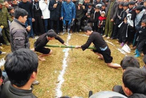 Cùng với ném còn là chơi kéo co cũng bắt đầu bằng hình thức kéo nghi lễ. Tốp nam đứng phía đông cầm phần gốc dây song (dây kéo co). Tốp nữ đứng phía tây cầm phần ngọn. Hồi trống kèn nổi nên thúc giục. Bên nam(đằng đông tượng trưng cho dương, mặt trời) luôn kéo thắng. Bên nữ (tượng trưng cho âm) giả vờ thua. Và như vậy, năm đó cả làng sẽ được mùa. Phần nghi lễ kết thúc, đông đảo nam nữ thanh niên cùng ùa vào chia phe thi kéo, kể cả du khách cũng có thể tham gia.