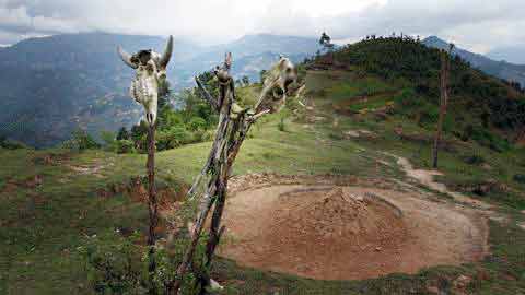 Khi có người thân trong gia đình chết đi, gia đình và bản làng sẽ mổ trâu cúng giỗ. Chiếc đầu của con trâu được giữ nguyên thịt, cắm trên đầu cây gậy mang ra chôn trước mộ của người chết. Theo phong tục cũ thì lễ cúng cho người mới chết ít nhất phải thịt 3 con trâu, nhưng đến nay tùy theo điều kiện kinh tế của mỗi gia đình mà chỉ mổ 1 con trâu, vì vậy nhìn vào số lượng đầu trâu (sọ trâu) treo trên mỗi ngôi mộ thể hiện lòng tôn kính đối với người đã chết, ngoài ra còn có thể biết rằng con cháu của người đã khuất nghèo hay giàu. Nếu giàu thì số lượng đầu trâu cắm trên cọc sẽ nhiều hơn. Đối với gia đình nào nghèo đói, kinh tế khó khăn thì vẫn phải cố gắng lấy 1 cái sọ trâu để treo, không thể không treo thứ đó ở trước mộ nhà mình vì đó đã trở thành phong tục bấy lâu nay, không ai được phép kháng cự.