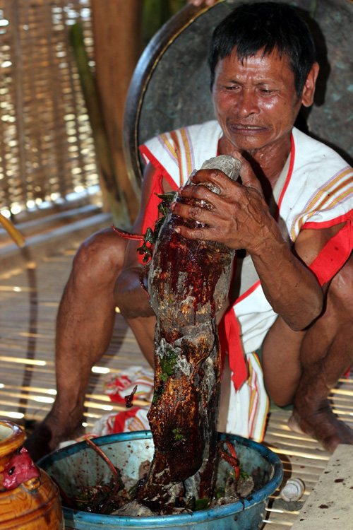 Ở giữa nhà rông, già làng A Reng long trọng mang Yang Plút từ cái giỏ ra đặt giữa sàn nhà rông. Đó là một cái ngà voi hóa thạch, dài chừng 0,5 m, to như bắp đùi người trưởng thành. Sau đó, già làng A Reng lấy máu heo gà… tắm cho Yang Plút, miệng thì thầm “nói chuyện”, đại khái đây là lòng tôn kính của dân làng, Yang Plút hãy “ăn” đi và phù hộ, độ trì cho dân làng.