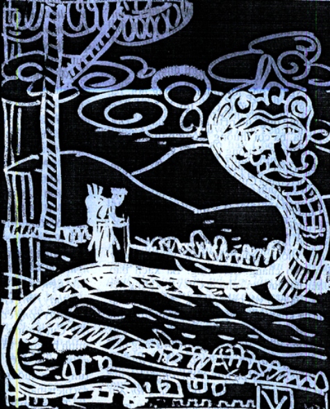 Thấm thoắt đã mấy năm ròng, mùa mưa ngâu tháng bảy đã tới. Mẹ chàng Cụt đeo gùi đi chợ ở xứ Yên Châu để mua sắm đồ về cúng giỗ và ăn tết rằm tháng bảy. Bà phải qua bao nhiêu đèo, bao nhiêu suối, bao nhiêu khúc sông mới đến được chợ. Hôm ấy, đi nửa đường trời mưa to kéo dài, bà đi đến khúc sông lớn thì không qua được. Tiếc công mò mẫm thắp đuốc đi chợ từ lúc nửa đêm, không nỡ quay về, bà đứng ở mé sông gọi to: “Cụt ơi! Au pè sống mè khảm tà pây chợ/ Se mè sắm sửa pẻng kin tết bươn đoi” (Cụt ơi! Lấy mảng đưa mẹ sang sông đi chợ/ Để mẹ sắm bánh ăn tết tháng ngâu”. Ở đâu, trong khoảnh khắc Cụt đã hiện về, thân mình to dài, khoang khoáy vằn đỏ, oằn mình vắt thân ngang dòng sông lớn nhẹ nhàng bảo: “Mẹ ơi! Thân con là cầu, mẹ bước trên sống lưng con mà sang sông tới chợ”. Cụt đưa mẹ đi chợ xong, lại đợi mẹ quay về rồi Cụt mới trở về biển khơi.