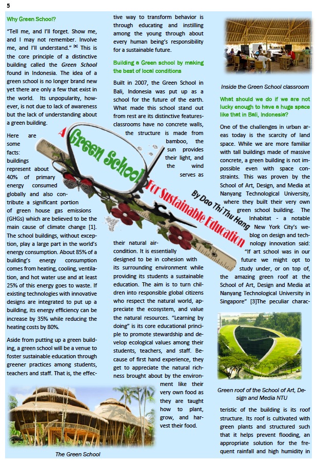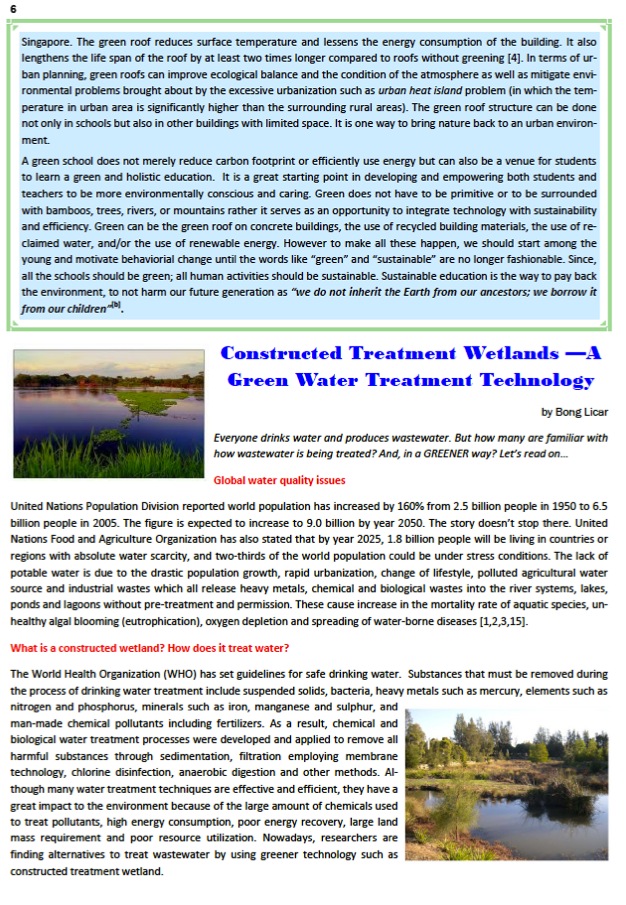 Green does not have to be primitive or to be surrounded with bamboos, trees, rivers, or mountains. There are many ways in making our surroundings more environmentally sound and sustainable. Green can be the green roofs on concrete buildings, the use of recycled building materials, the use of reclaimed water, and/or the use of renewable energy. Adopt a holistic approach is essential to integrate technologies and innovations, to educate and motivate. However to make all these happen, we should start among the young and motivate behaviorial change until the terms like “green” and “sustainable” are no longer fashionable words. Since, all the schools should be green; all human activities should be sustainable. Sustainable education is the way to pay back the environment, to not harm our future generation as “we do not inherit the Earth from our Ancestors; we borrow it from our Children” [b]