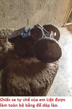 Đang nói chuyện, em Thao con gái thứ bảy của bố mẹ Jêu khoảng năm tuổi đi vào, trên tay em Thao cầm một chiếc xe công nông tự chế bằng đế dép lào màu đen. Nhìn chiếc xe mình bái phục tính sáng tạo và khéo tay. Mình hỏi bố Jêu ai đã làm chiếc xe này? Bố Jêu cho biết các em muốn có xe chơi nhưng không có tiền mua, em Thoal con trai học lớp Chín lấy chiếc dép đứt làm ra chiếc xe công nông này. Chị đi với mình cũng phục sự khéo tay của em Thoal, chị nói với em Thao đang cầm chiếc xe:
