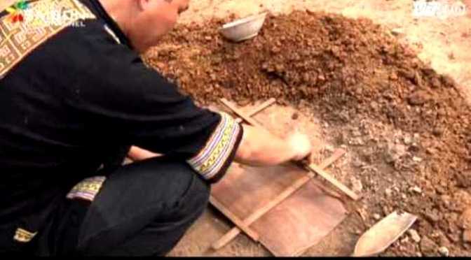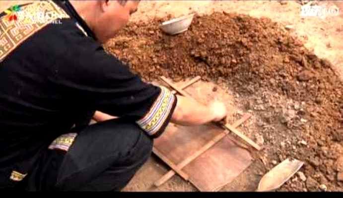 Chọn nơi đất mịn, không có sỏi đá và bằng phẳng, dùng dao nhọn, sắc khoét một hố tròn đường kính 20cm, sâu 35cm, ở giữa phình ra kiểu hình chum, rộng khoảng 40cm, dưới đáy thắt lại bằng miệng hố. Hai chiếc mo nang khô úp tráo đầu chồng lên nhau che kín miệng hố. Lấy 4 que nhỏ ghim xung quanh, dùng nẹp tre ghim 4 bề để ép phẳng mo nang. Hai cọc bương cắm hai bên, cách tâm mặt trống mỗi bên 1m. Lấy sợi dây rừng nối hai đầu cọc, căng thật thẳng. Sợi lạt tre thắt nút một đầu, xuyên giữa mặt trống, luồn lên trên buộc vào giữa sợi dây rừng. Thế là có một chiếc trống đất.