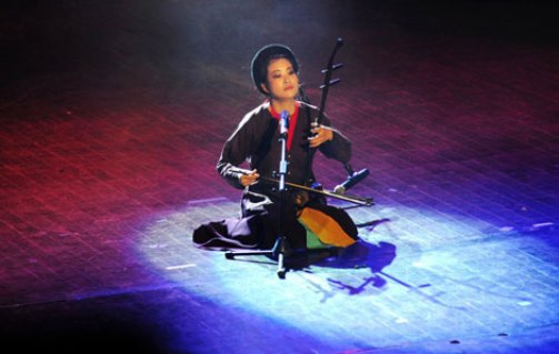 Khăn mỏ quạ, áo yếm hồng cánh sen, áo tứ thân nâu sồng giản dị, người phụ nữ tay kéo nhị, cất lên giọng hát với những cung bậc trầm bổng ngân nga thiết tha tựa hồ nghe như gió reo, mưa rơi, thác đổ, lúc từ từ dịu nhẹ như chiếc lá rơi xuống đậu trên nền đất.