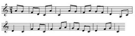 Nếu chuyển ghi bản nhạc trên sang lối ký âm trên khuông nhạc 5 dòng kẻ, ta sẽ có hình dáng giai điệu của nó như sau: (trích 10 nhịp đầu)