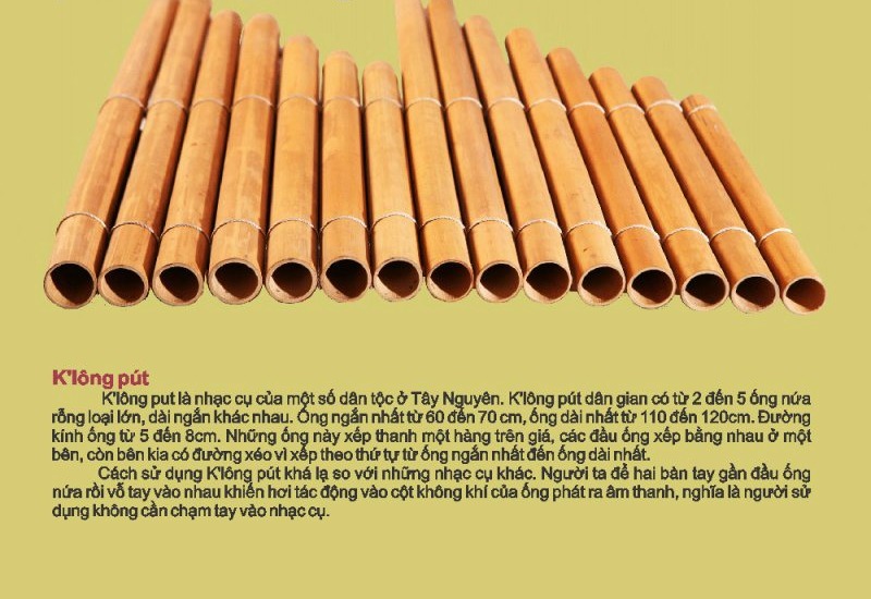 K’lông Pút dân gian có từ 2 đến 5 ống nứa rỗng loại lớn, dài ngắn khác nhau. Ống ngắn nhất từ 60 đến 70 cm, ống dài nhất từ 110 đến 120 cm. Đường kính ống từ 5 đến 8 cm. Những ống này xếp thanh một hàng trên giá, các đầu ống xếp bằng nhau ở một bên, còn bên kia có đường xéo vì xếp theo thứ tự từ ống ngắn nhất đến ống dài nhất.